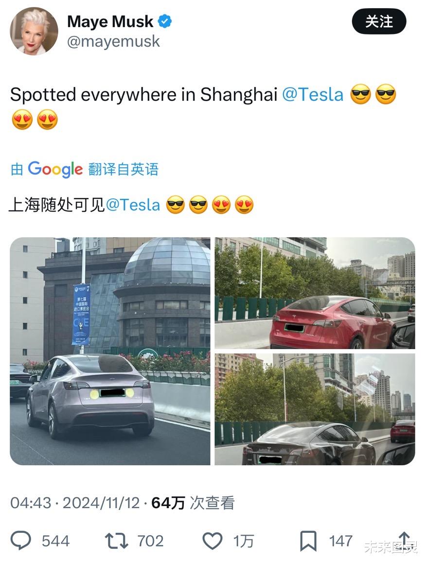 11月12日,马斯克的母亲梅耶·马斯克在社交媒体上自豪地分享了儿子在上海的杰出成就,她宣称:“在上海,特斯拉的身影无处不在。”