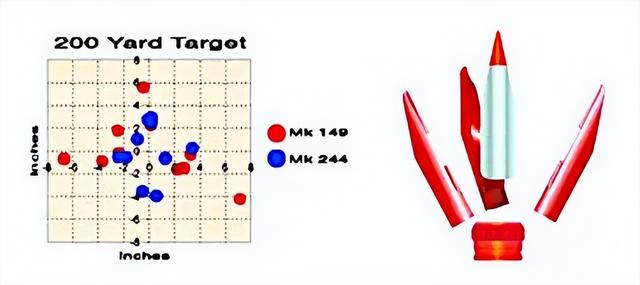 这张图显示了Mk 244和Mk 149的相对射击分散。Mk 244的次口径钨弹与塑料弹壳分离的描述也可以在右侧看到。