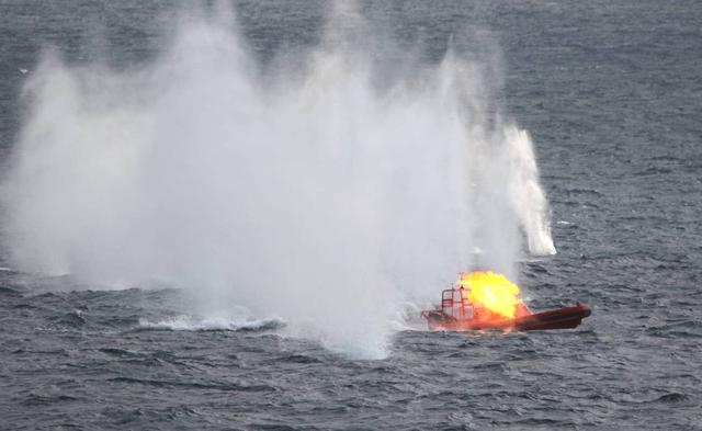 一艘靶船在训练中被美国海军提康德罗加级巡洋舰“安提特姆”号上的“密集阵”近程防御系统击中后燃起火焰。