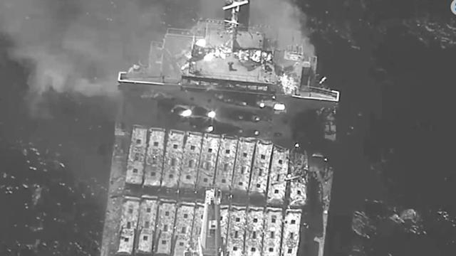2024年3月6日,在胡塞武装导弹袭击后,悬挂巴巴多斯国旗的货轮“真正的信心”号正在燃烧。至少有三名船员在袭击中死亡,其他人受重伤。