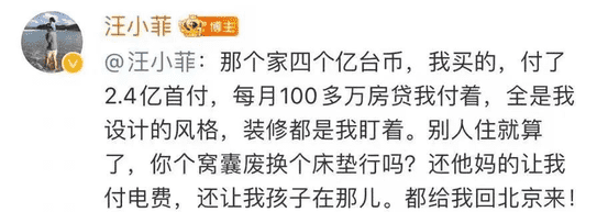 先说说这离婚协议。当初两人签的时候,估计也是想着好聚好散,给彼此留点体面。可这协议,现在看来,更像是一道枷锁,把汪小菲牢牢地锁住了。每个月一百万的抚养费,这可不是个小数目,再加上台北的房贷、水电费,汪小菲这荷包,可是大出血啊。有人说,汪小菲是富二代,这点钱算什么?可问题是,他现在自己创业,生意做得也不容易,这钱也不是大风刮来的。再说了,就算他家底再厚,这无底洞似的支出,谁能扛得住?