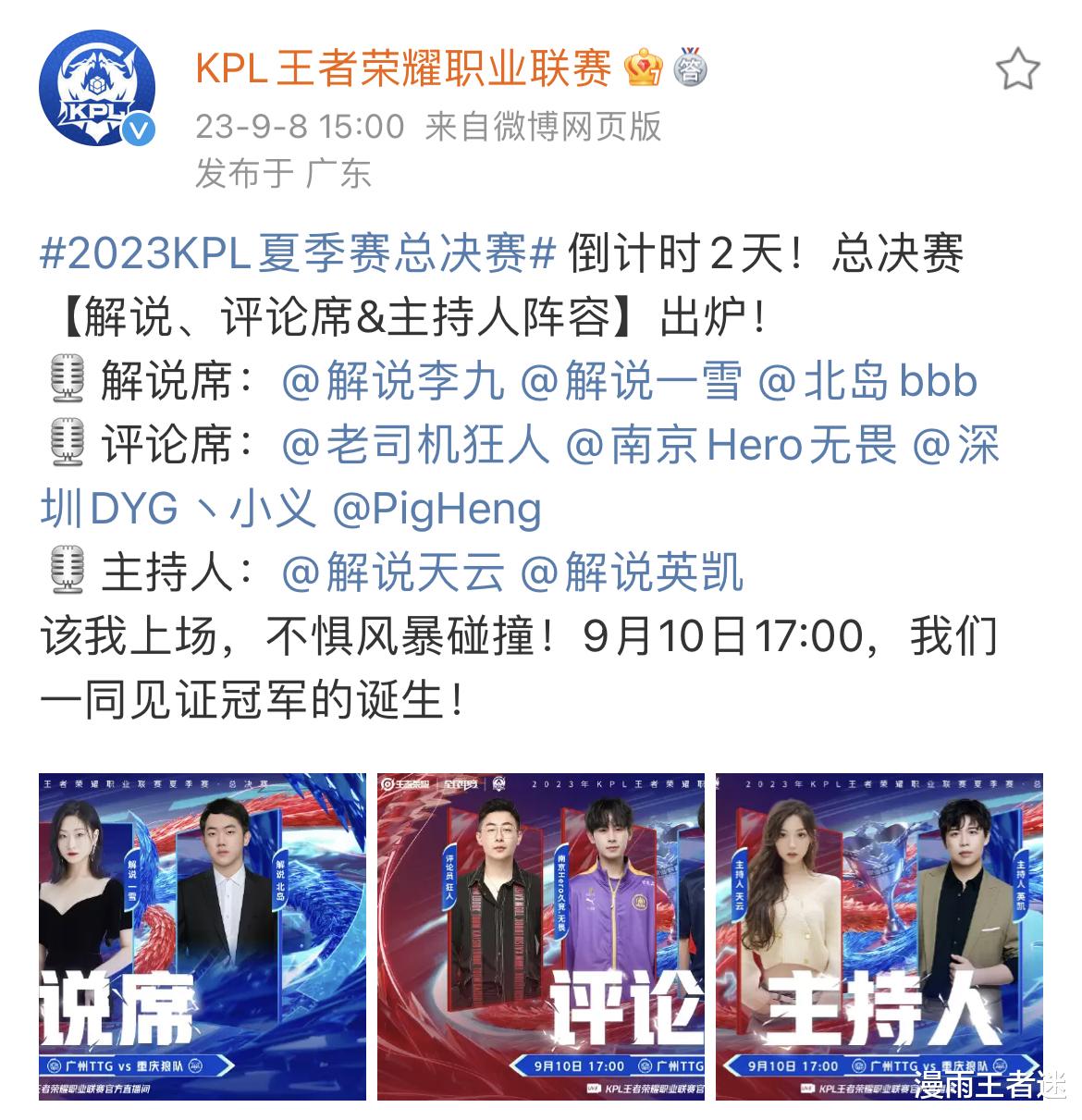9月10日,2023年KPL夏季赛总决赛(狼队大战TTG)就要正式开打了,日子已经越来越近了。前面就有瓜主曾剧透过此次KPL总决赛评论席的两位嘉宾。如今看来这位瓜主的消息还还真的是比较准的,还真的是“义无反顾”,即DYG小义、hero久竞无畏这对哥俩都上了。原本大家伙们想着,此次KPL总决赛的评论席嘉宾都这么豪华了,那解说阵容就更是如此了。然而,这一回KPL联盟的安排,就确实是让人有些难以理解了。甚至KPL观众都炸锅了,因为解说阵容实在是太寒酸了。怎么一回事呢?咱们一起来了解一下吧?