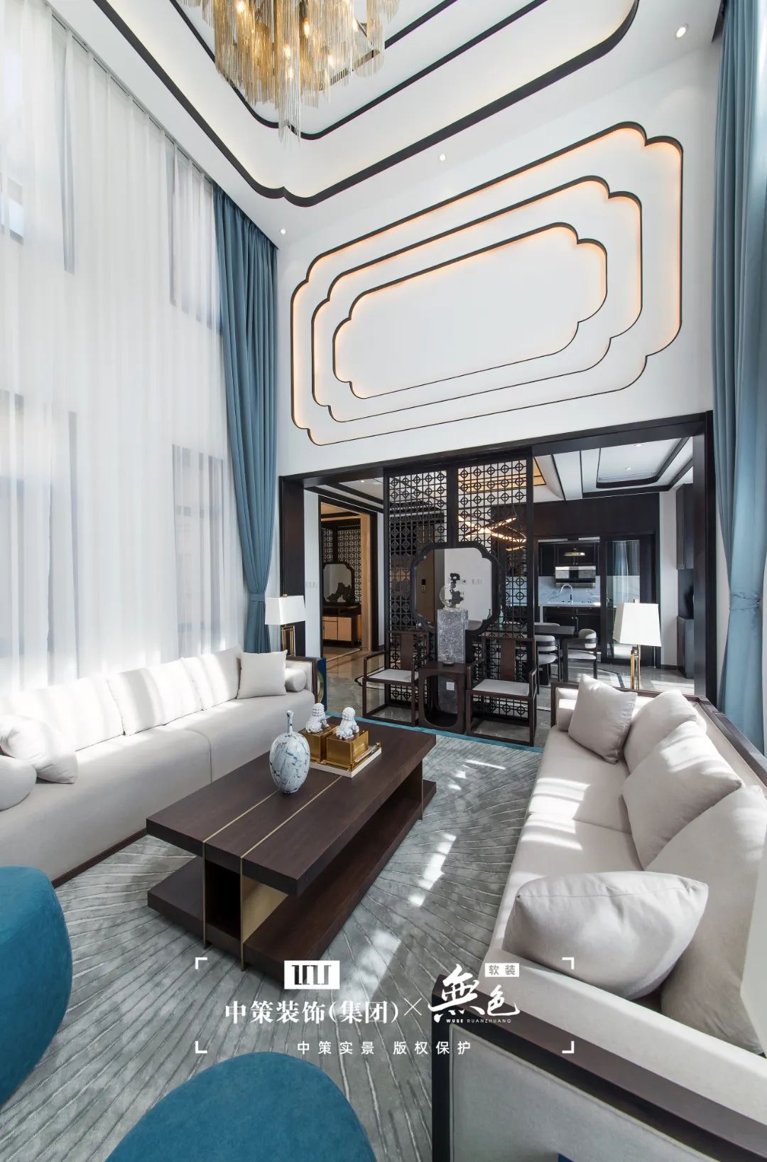 丰富顶部造型可减少挑空设计带来的空旷感。通过一些硬装上的艺术处理,如彩绘图案,石膏雕塑造型,极具设计感的吊灯等,搭配软装家具布置,为别墅空间找回平衡感,彰显业主的个人品味和个性。