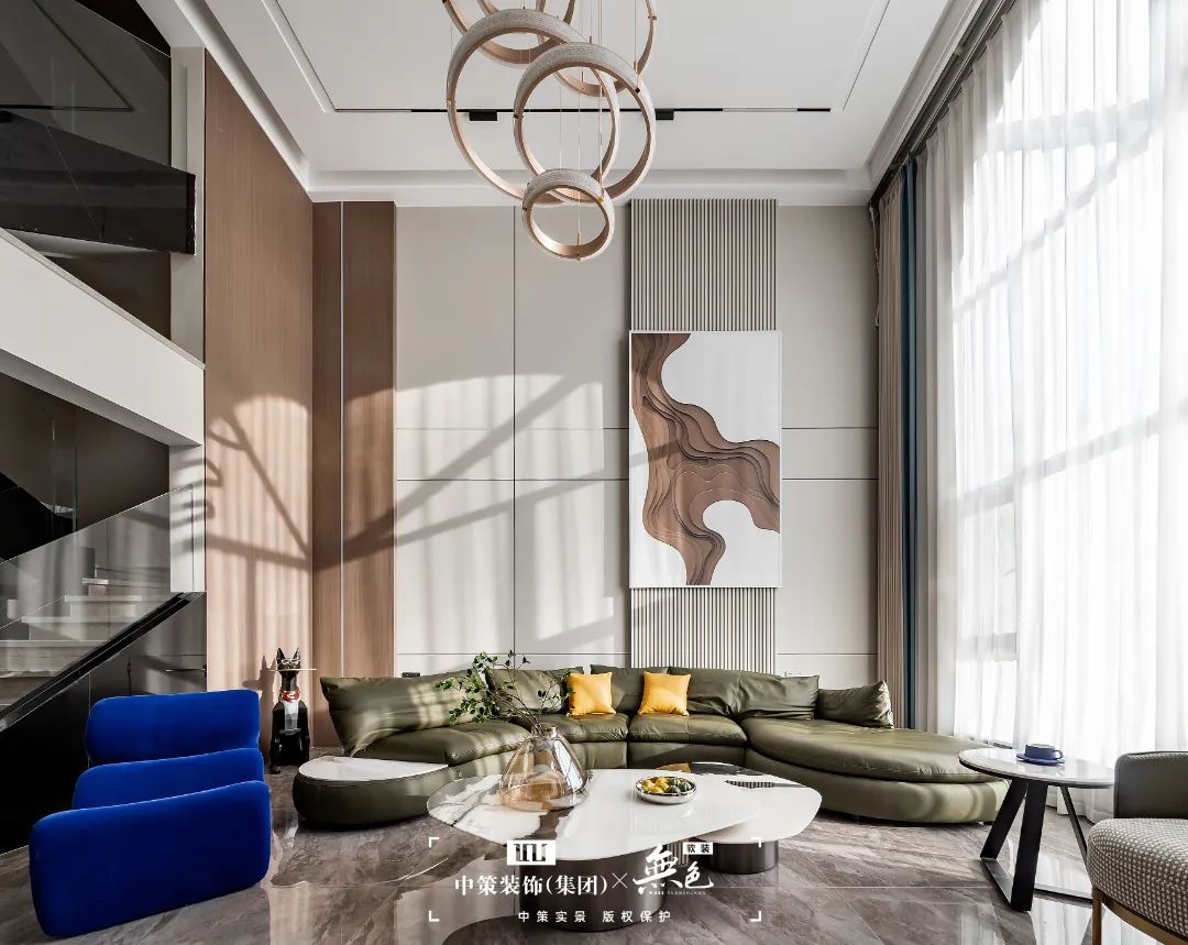 鉴于挑空设计的特殊层高,主背景墙往往需做到顶,且要符合空间的设计主题和风格,确保空间的气派与品质感。其他墙面可通过柜体定制来增加收纳空间,或者使用挂画以及软装装饰品进行装饰。