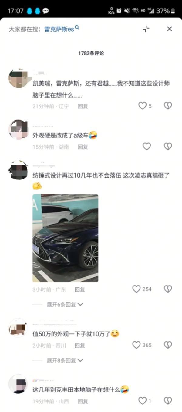 品牌形象不单单是外观设计,它在消费者心中更是一种情感的寄托。有一位车主在社交媒体上分享了他的感受:“这次换代就好比我从小一直暗恋的白月光,当我有能力再见到她时,她却将黑发染成了黄毛,打了唇钉,甚至在身上纹了一根难看的线条。”这一比喻深刻地反映了雷克萨斯ES这次改款所带来的情感落差。消费者对于一款车型的热爱,不仅源于它的外观和性能,更在于它在他们的生活中占据的重要地位。