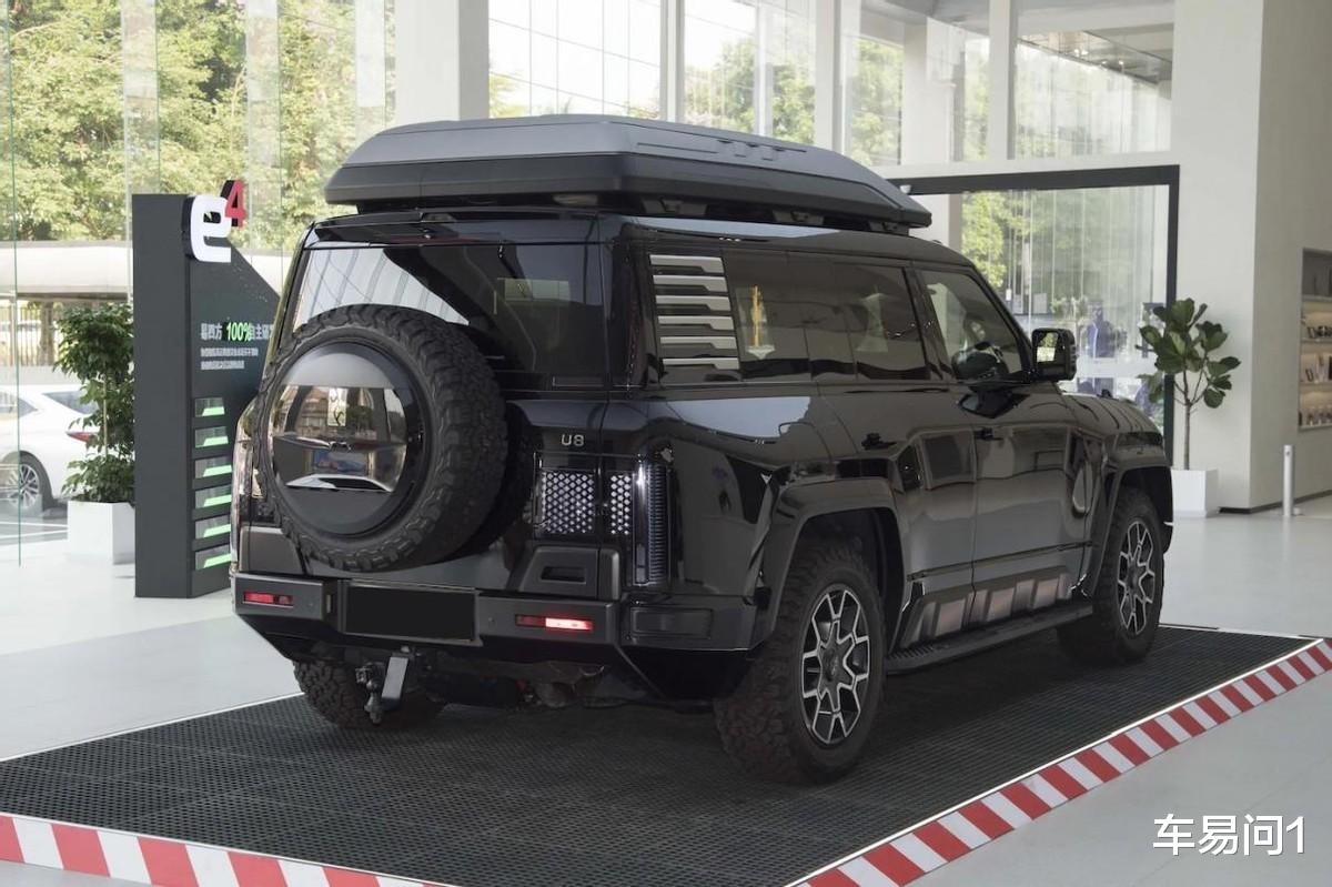 车尾来看,仰望U8提供了全尺寸外挂备胎,尾灯采用了L型光带+密集光珠组合设计,后保同样是大尺寸、大隆起运动包围,还会提供手动拖挂钩可选,配合车外的涉水喉,深度越野通过性是值得信赖的。
