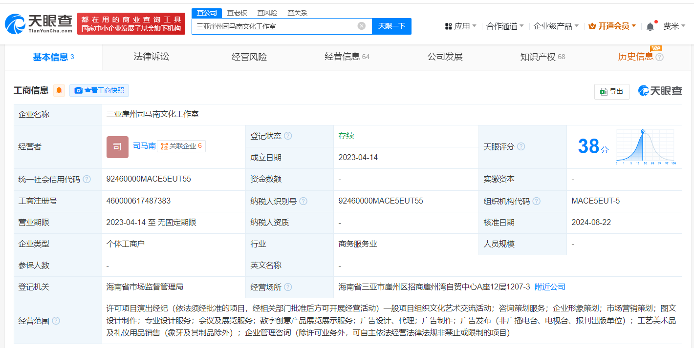 天眼查财产线索信息显示,近日,三亚崖州司马南文化工作室申请的多枚“司马南”商标注册成功,国际分类包括教育娱乐、皮革皮具、布料床单等,上述商标申请于2024年10月。