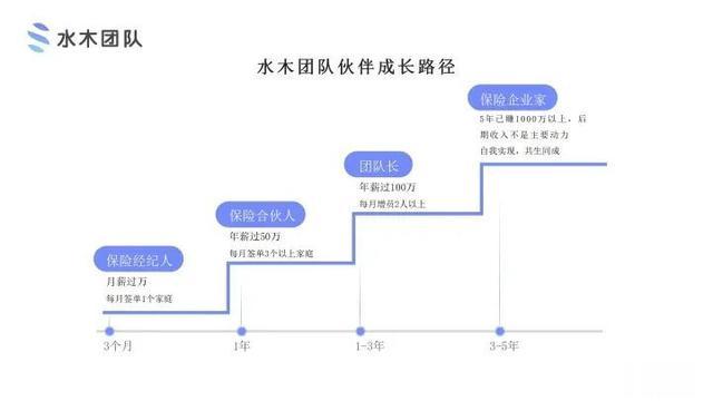 新人期后就月入过万,每月签单一个家庭即可。1年后,成为公司的合伙人,收入能到50万的量级(明亚经纪人以上职级的人的平均收入)。3年内,成为团队长,收入到100万的量级。5年后,晋升为保险企业家,收入不再是最主要的动力。这是一个标准的成长路径,优秀的伙伴可能2年多就能完成5年的规划,但大部分人可能还是按照规划一步步走。