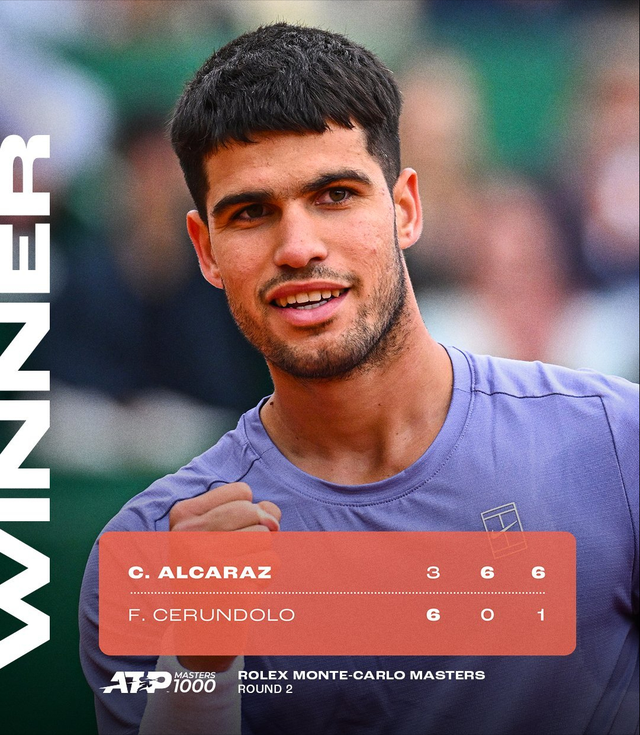 另外,2号种子阿尔卡拉斯终于在蒙特卡洛大师赛“开胡”,他在3-6先输一盘的情况下,6-0和6-1连扳两盘,击败塞伦德罗闯进16强。阿尔卡拉斯在蒙特卡洛22年一轮游输给科达后,连续2届因伤未参赛,拿到首胜后,他在镜头前写下“I missed clay。”