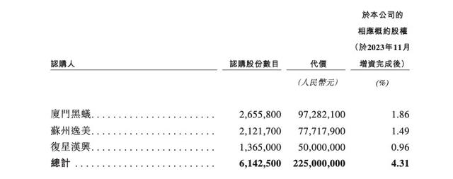 根据招股书,苏州黑蚁、苏州逸美及复星汉兴等三名认购人认缴老铺黄金新增股本614.25万股股份,总代价为2.25亿元。