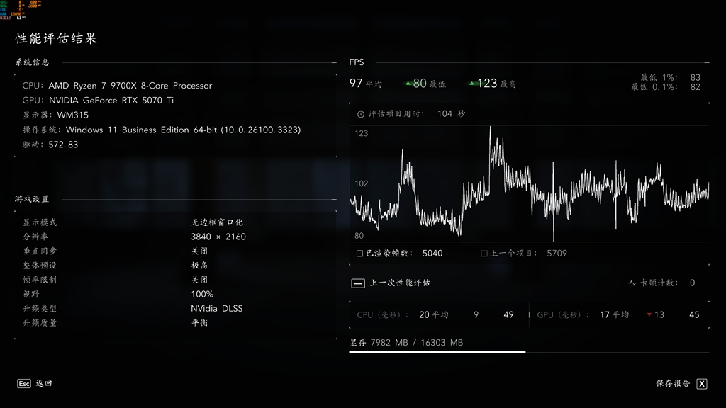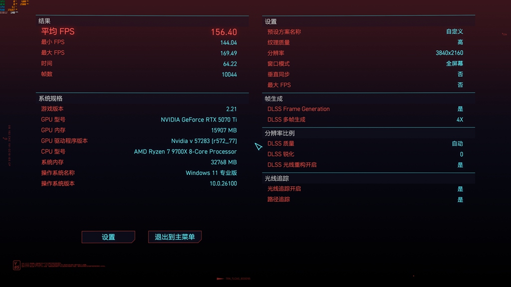 画质测试:4K分辨率,关闭动态分辨率,设定极高画质,设定光追很高,打开DLSS,打开帧生成,平均FPS,97。
