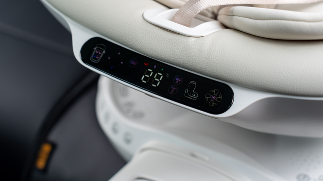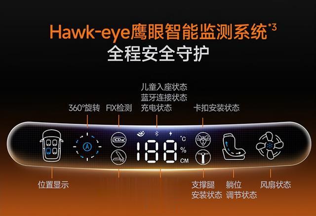 座椅上的超大显示屏,可以实时展示座椅位置、旋转方向、FIX接口安装状态、宝宝入座状态、座椅温度、头靠高度、安全卡扣安装状态、支撑腿安装状态、躺位调节状态以及风扇状态,图形化的设计通俗易懂,新手爸妈都能一眼掌握座椅和宝宝的状态,安全看得见。