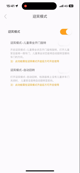 如果想要宝宝下车的时候让智惠也自动转向车门,我们只需要把迎宾模式里的儿童乘坐开门旋转打开就行。智惠的内部安装了智能监控芯片,可以实时判断是否有宝宝坐在座椅上,来实现不同的回转。