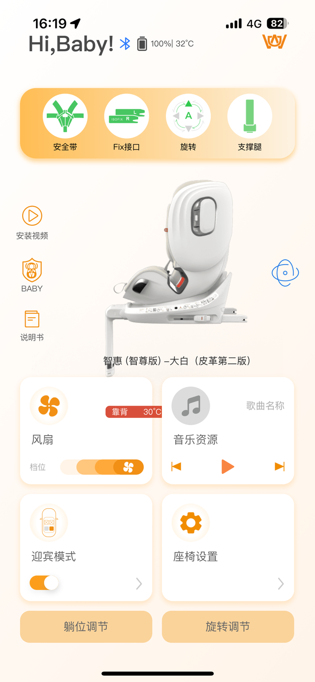 在APP里,我们还可以实时看到智惠的使用状态,宝宝是否入座,甚至还能播放音乐、讲故事,一个人也能轻松哄娃,把安全和快乐都交给惠尔顿,让出行更快乐。