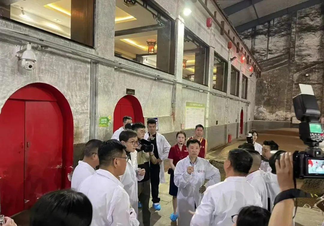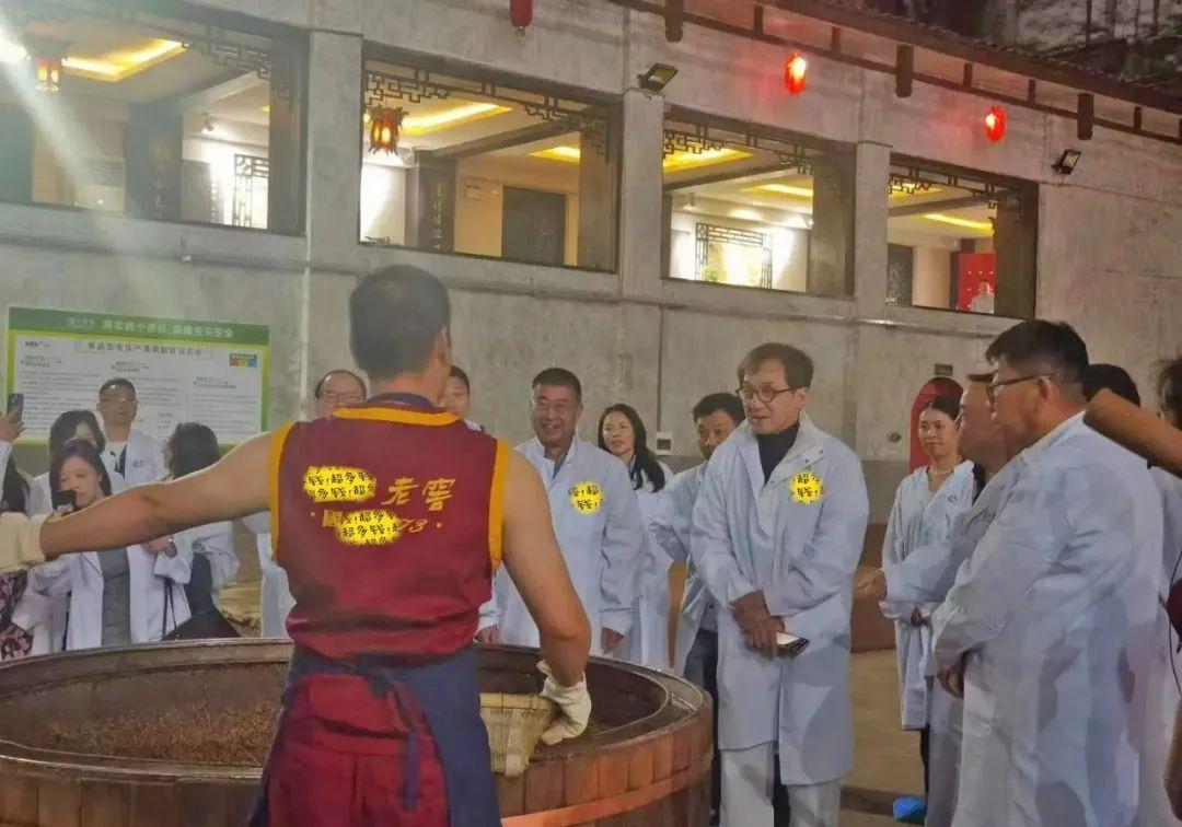 成龙穿上了白大褂,到酒厂里耐心听工作人员讲解,周边有很多人陪同,还有多个摄影师拍下整个参观过程,画风看起来更像是领导视察。