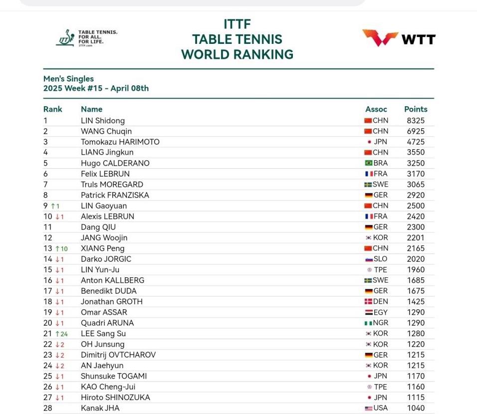 北京时间4月8号,国际乒联官网更新了最新的世界排名。因为仁川冠军赛和奥托塞克支线赛结束了,好多运动员的排名都发生变化了。男单这边,排名变化最大的是仁川冠军赛的男单亚军李尚洙,他一下子上升了24名,现在排在第21名。然后就是冠军向鹏,他也上升了10个名次,现在排在第13名,这是他第一次进入前15,创造了个人职业生涯的新高。其他的选手里,变化比较大的还有WTT支线赛奥托塞克站的男单冠军西蒙·高茨,他的排名也上升了5名,现在排在第55名。世界前十的选手里,林高远上升了一名,现在排在第9;艾利克斯·勒布伦下降了一名,现在排在第10;其他的运动员都没变,林诗栋还是稳稳地排在第一位。具体的前30名排名就是这样啦。