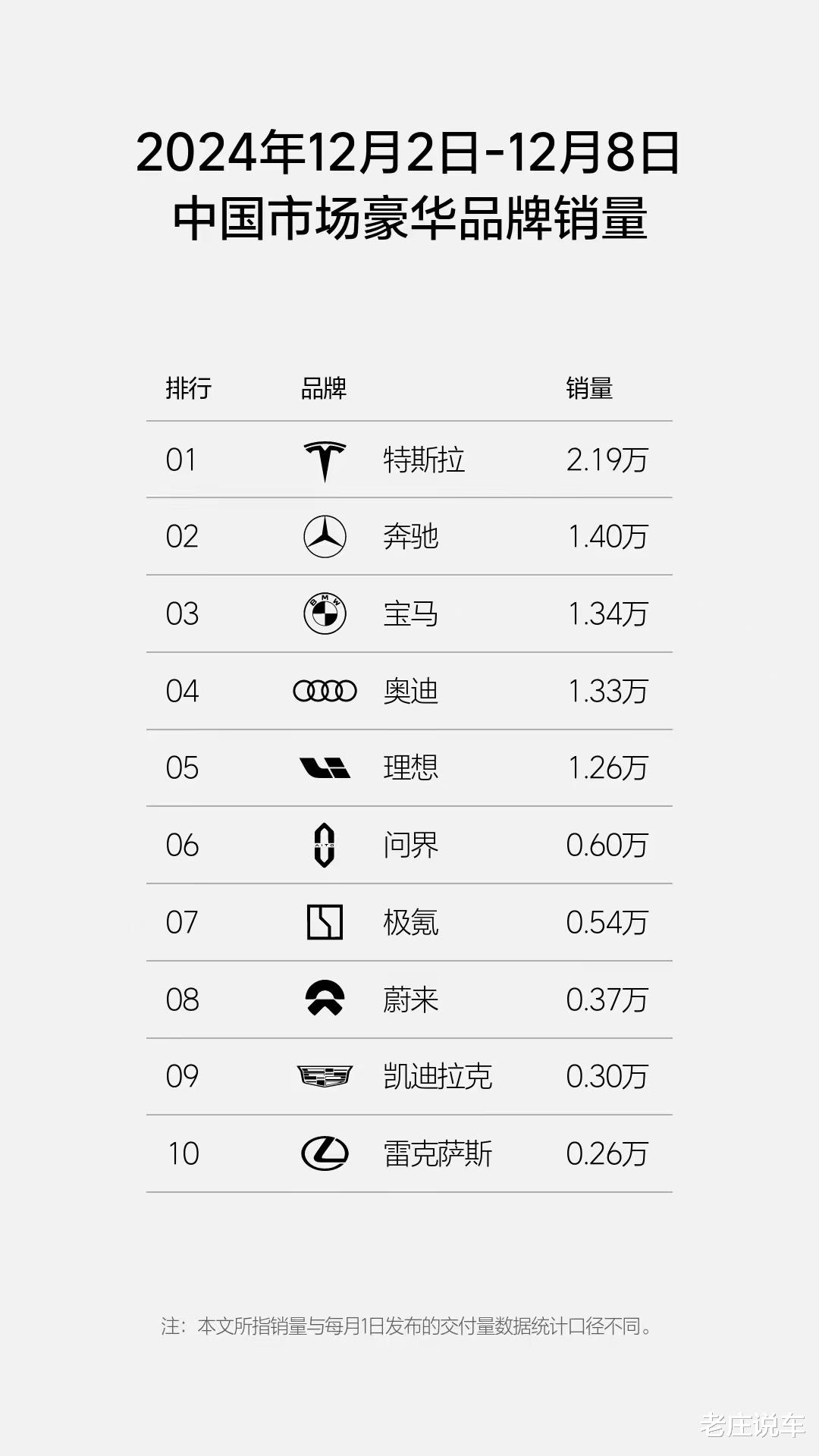 本周豪华品牌销量榜看点是,特斯拉反超宝马夺冠,宝马退2位排名第3。