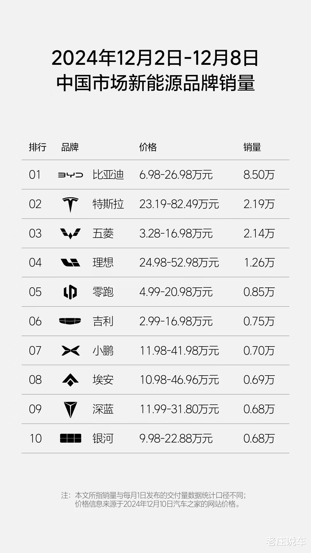 小结:12月第1周新能源销量,比亚迪遥遥领先,特斯拉夺冠,宝马第3。