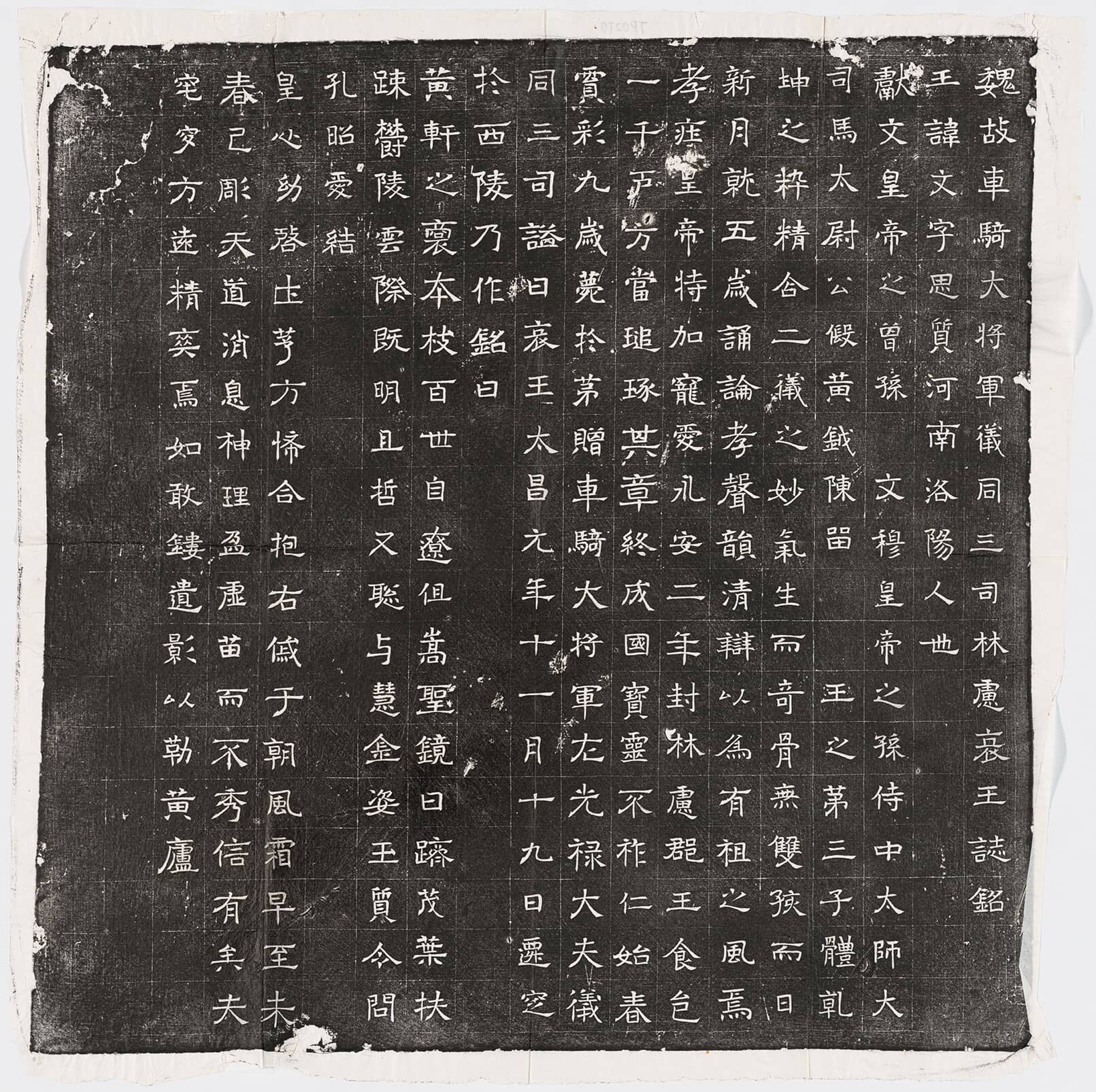 北魏《元文墓志》,灰白色石质、正方形、盝顶盒式。志盖已佚。志文楷书、十七行、满行十九字、共三百八十一字、有界格。首题「魏故车骑大将军仪同三司林慮哀王志铭」。一九二〇年出土于河南省洛阳后海资村北。志主姓元、名文、字思质、河南洛阳人。献文皇帝之曾孙、陈留王第三子。永安二(五二九)年封林慮郡王、永安三(五三〇)年卒、享年九岁、赠车骑大将军、左光禄大夫、仪同三司、谥日哀。太昌元(五三二)年十一月十九日迁葬于西陵。志石会经陶湘,徐森玉收藏。