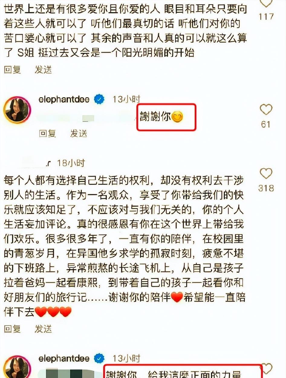 当然,看到这样调侃的评论也有网友在线安慰小S,表示这个世界上还有很多爱她的人,不要听不要看那些负面的,感受爱她的人对她的苦口婆心就可以了,其余人的声音就那么算了吧。随即小S回复该网友:谢谢你。还有《康熙来了》的粉丝留言安慰,小S也是感谢粉丝的正能量。