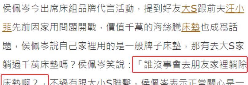 当事人回应目前的处境还ok,好友侯佩岑也来助攻。侯佩岑在参加最新的活动时,先是被媒体问到最近大S的家务事,媒体还引用床垫梗,问侯佩岑去大S家的时候有没有躺过那张床垫,侯佩岑笑着回应:谁没事会去朋友家里睡不要的床垫。