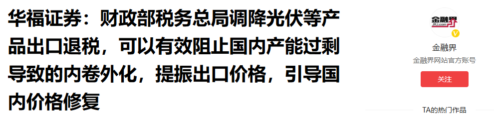 参考资料:《华福证券:财政部税务总局调降光伏等产品出口退税,可以有效阻止国内产能过剩导致的内卷外化,提振出口价格,引导国内价格修复》——金融界