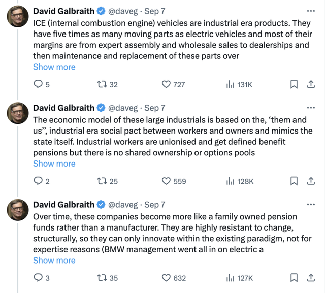 他说,电动汽车看起来和德国制造出来的燃油汽车没什么差别,然而从生产设计、商业模式和利润结构,已是完全两个物种。以下是高伯瑞斯发在社交媒体的评论原文。