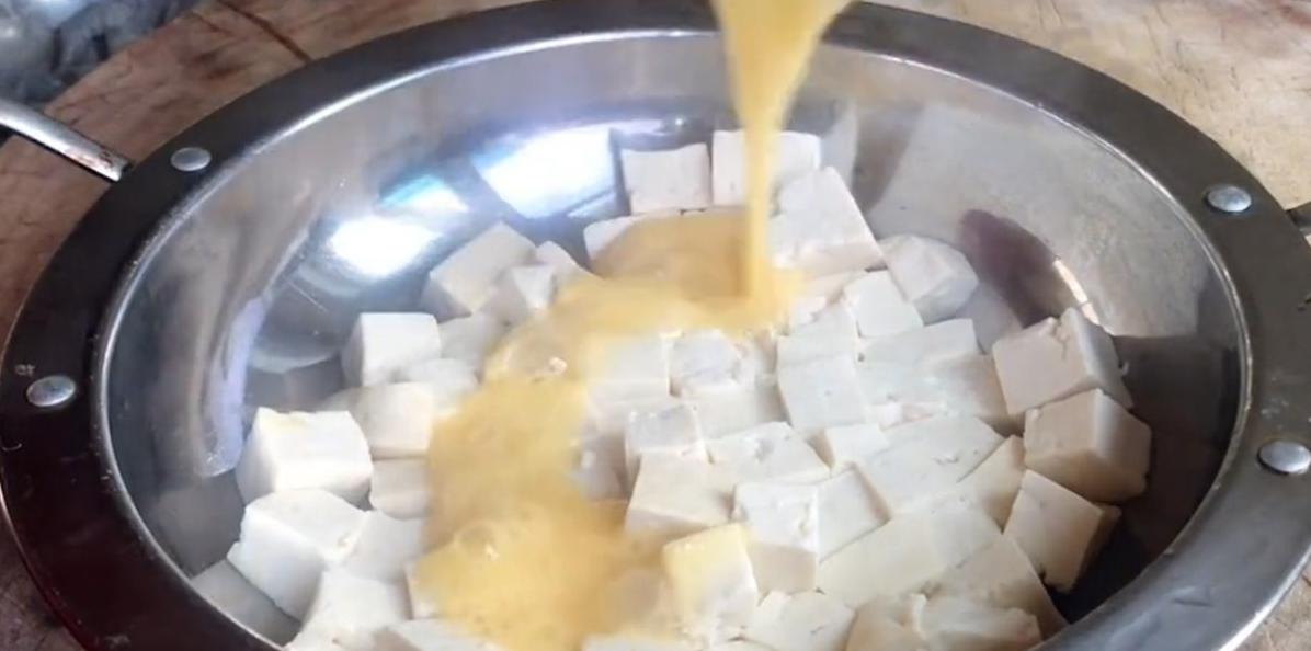 然后打入鸡蛋液,豆腐裹鸡蛋煎至金黄,加入虾仁和汤汁炖煮几分钟即可。