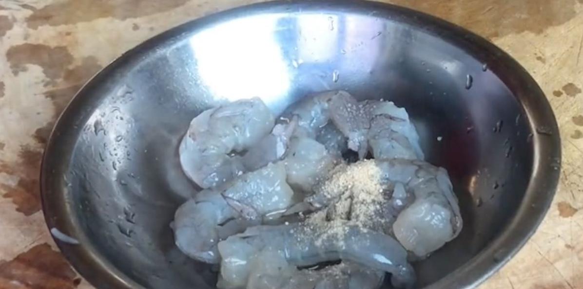 制作步骤也很简单,从处理虾仁开始,去虾线,清洗干净,然后给虾仁调个底味,用盐、料酒、胡椒粉腌制一下,再抓入少许玉米淀粉锁住水分。