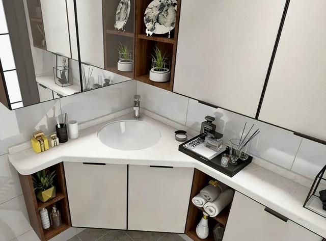 其实我们可以通过转角异形柜来改变“空间不规则”的问题,让卫生间的每一寸空间都能够得到最大限度上使用。