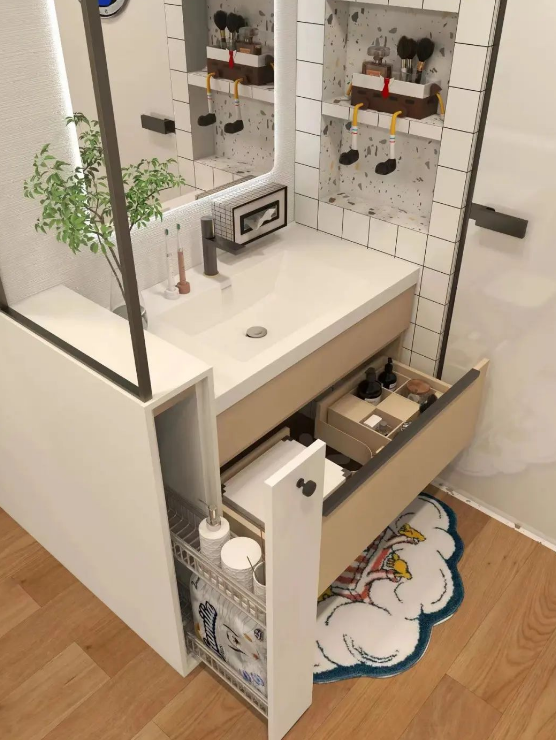 同时还能够提高卫生间的使用效率,还能让洗手台下面的空间得到更有效的利用,比如改造成分层的收纳空间,方便收纳更多不同类型的杂物。