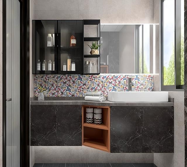 同时在安装镜柜的时候采用“藏八露二”的设计,这样我们可以通过封闭的部分空间来收纳一些使用频率低的瓶瓶罐罐,又可以在开放式收纳柜里面摆放上一些摆件来增加卫生间内的颜值和和观赏性。