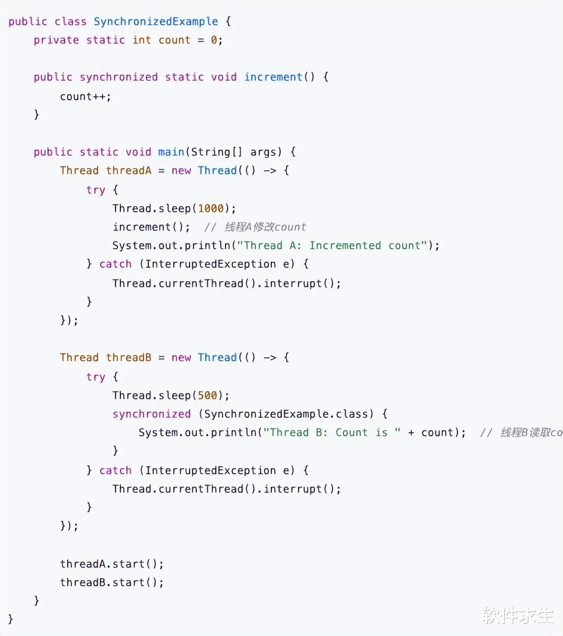 在这个例子中,increment方法被synchronized修饰,确保每次只有一个线程可以修改count。线程B在读取count时需要获取锁,确保它读取的值是最新的。