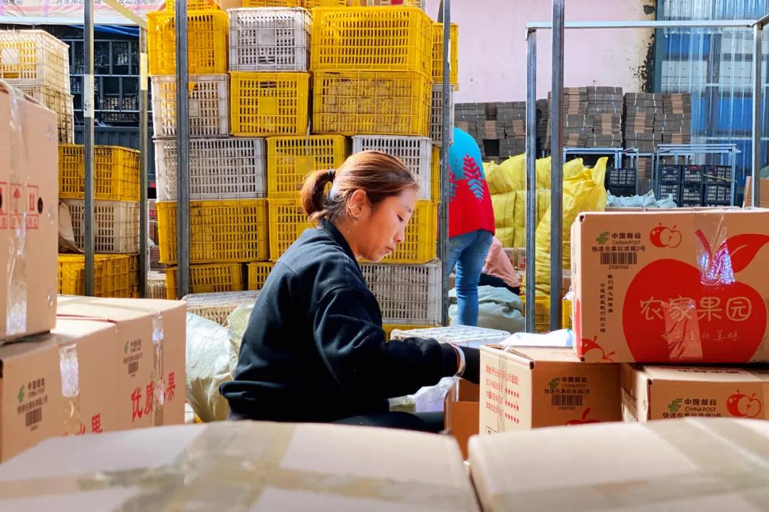 (▲电商企业优先雇佣合作社种植户,为农民增收提供了新机会。图中为山西临猗的打包女工。)