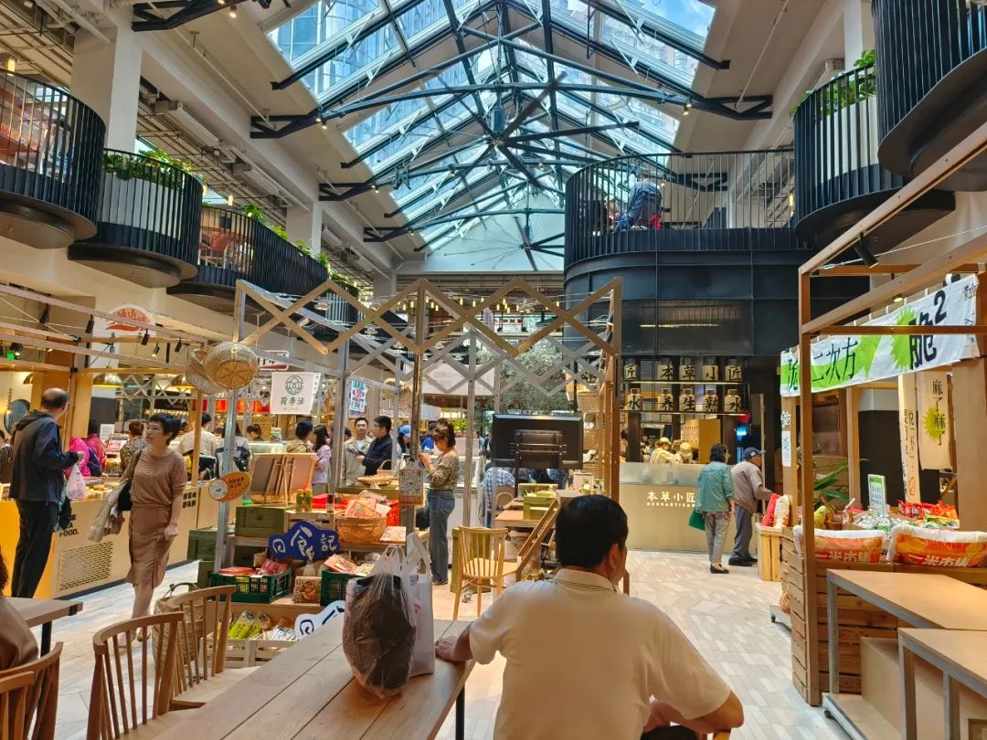 3. 最接地气的“小菜场”。在鸿寿坊市集这个新物种里面有一个400平方米的荟森生鲜专营店,里面有益田生态农场体验店,同样邀请了18家个体经营者开店,各地街头老字号、品质网红与口碑名店铺共30多家。