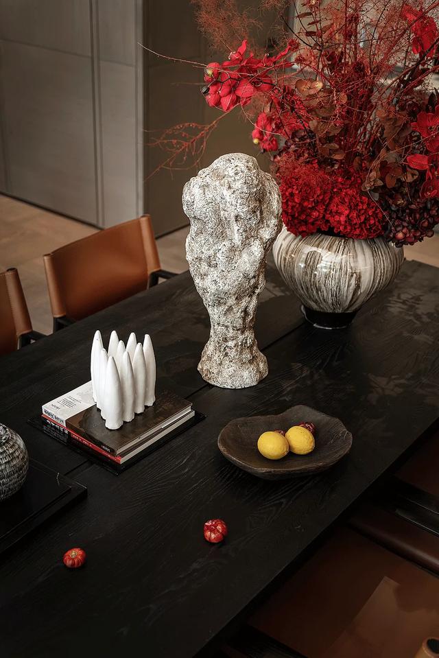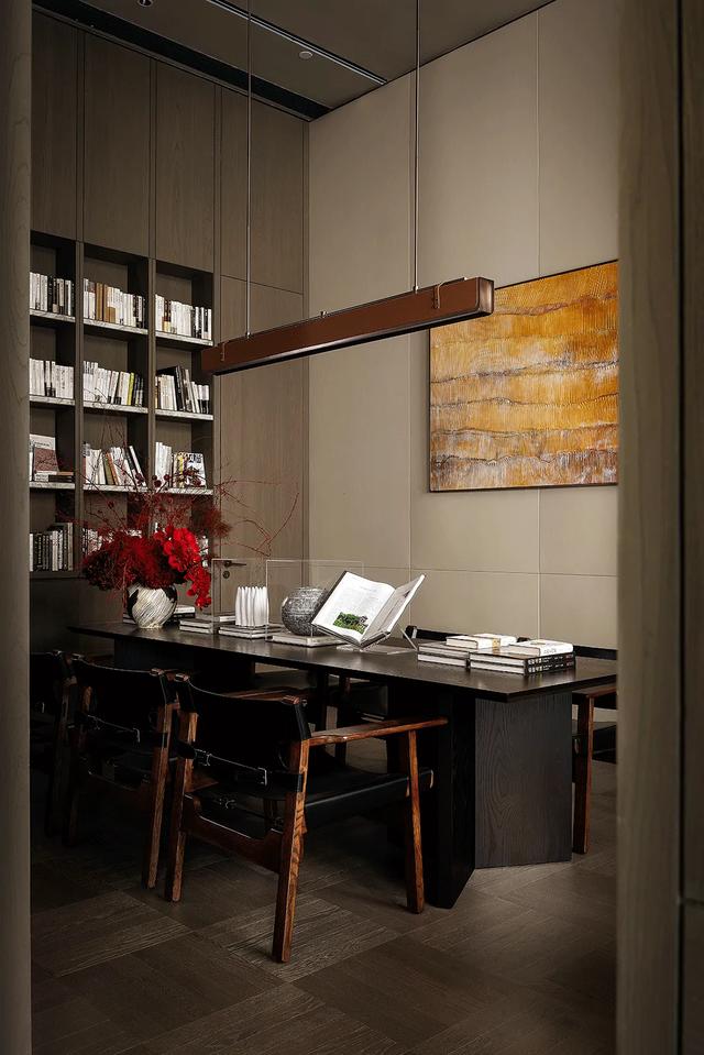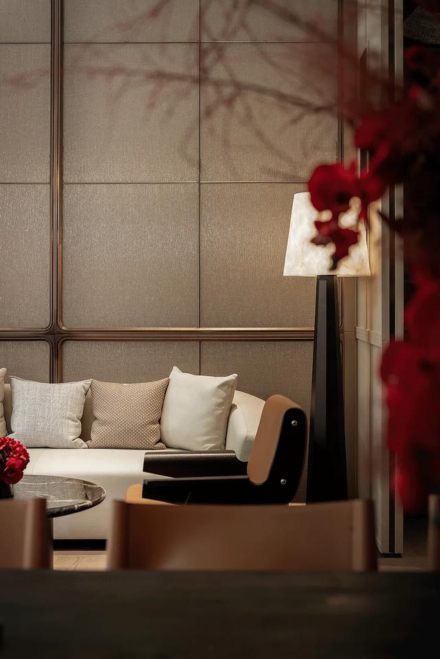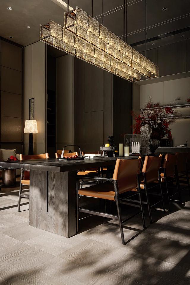 用同样温柔低调的咖色、深色用以中和金属质感的冰冷,呈现华而不俗的摩登质感。米色与棕色的家具拼接,皮革和金属等丰富的肌理叠加,将精致时尚的现代都会气息拉满,传达出对生命的感知与奢美的追求。
