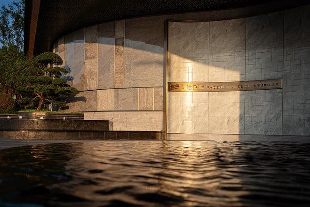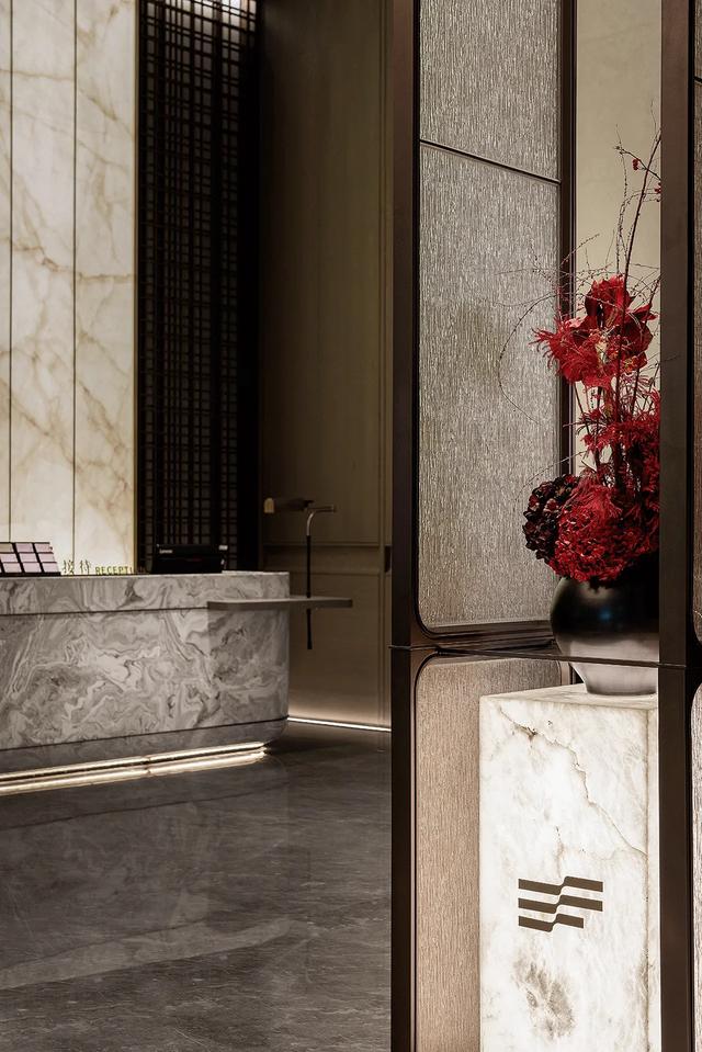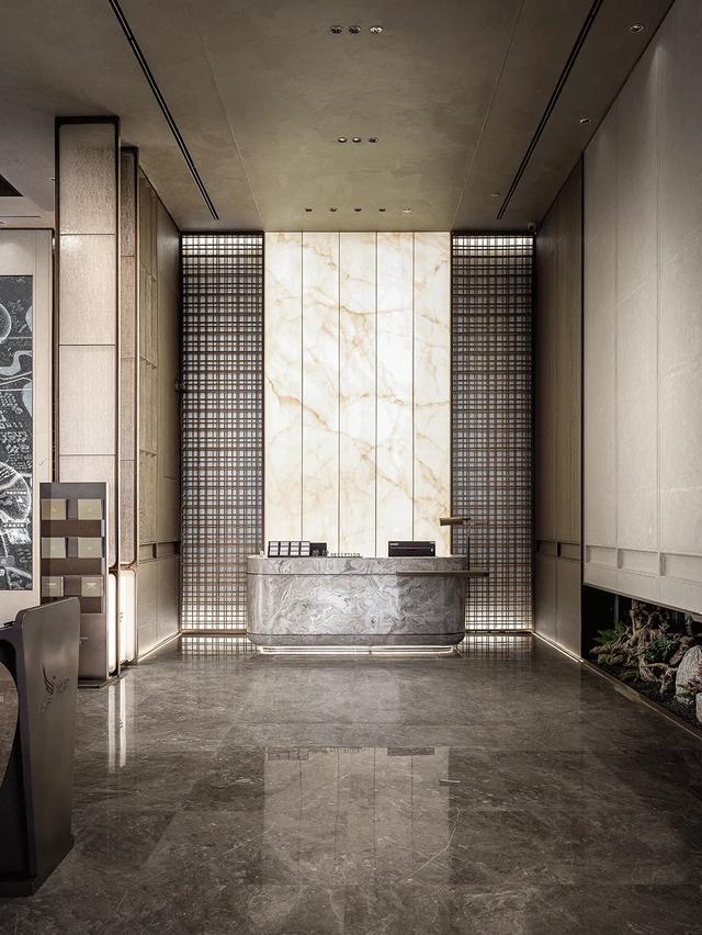 天然石材交错成序,奢石的纹理搭配手敲铜的质感,辅以天然云石的光泽,精心布置的微景观做为点睛一笔,突显到访客户的尊贵身份。