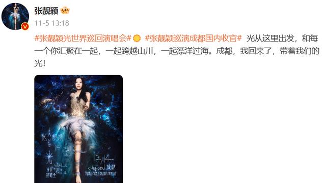 最近,张靓颖又开始了新一轮的巡回演唱会,11月5日,她发文称:光从这里出发,和每一个你汇聚在一起,一起跨越山川,一起漂洋过海。成都,我回来了!带着我们的光!