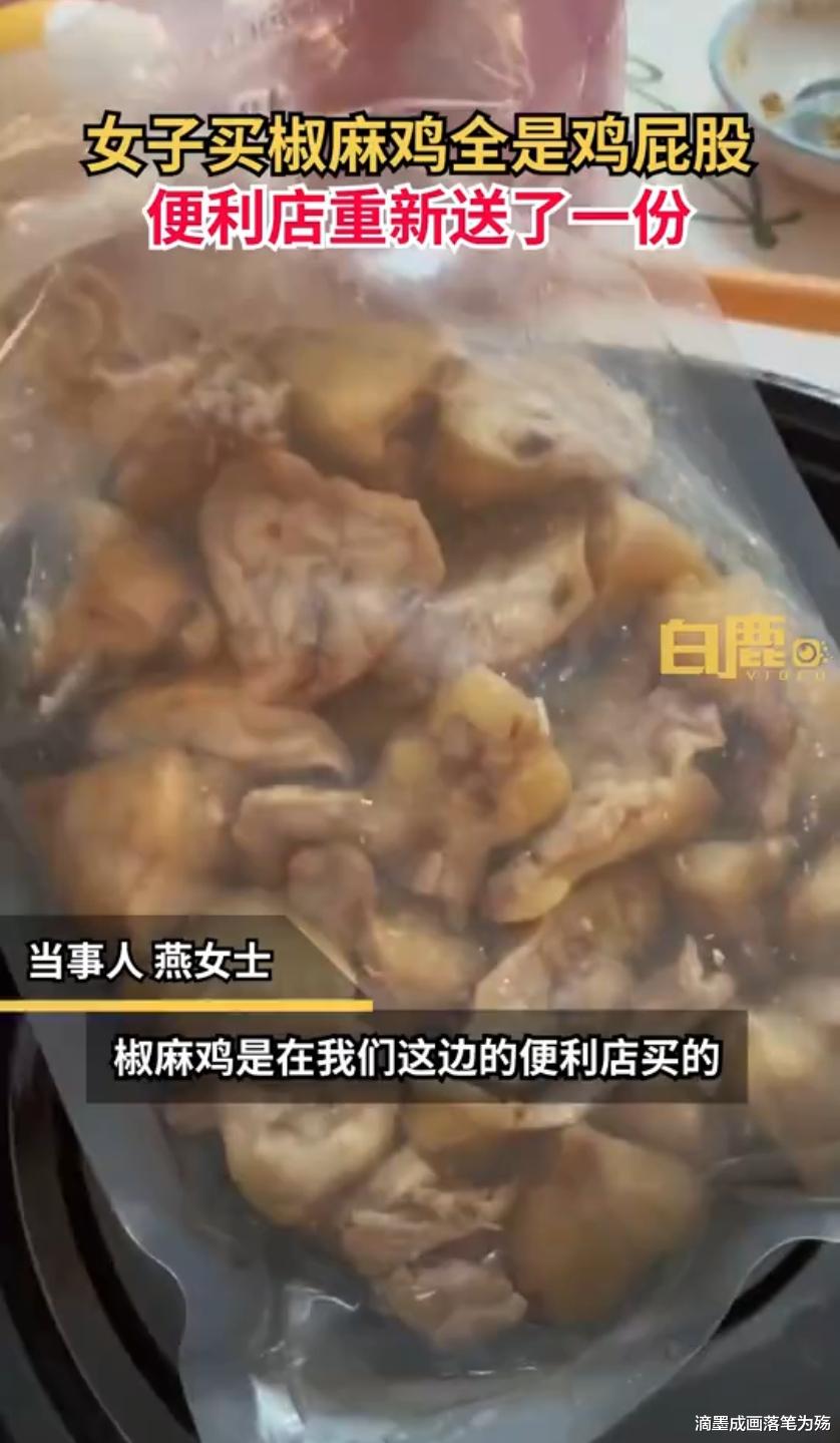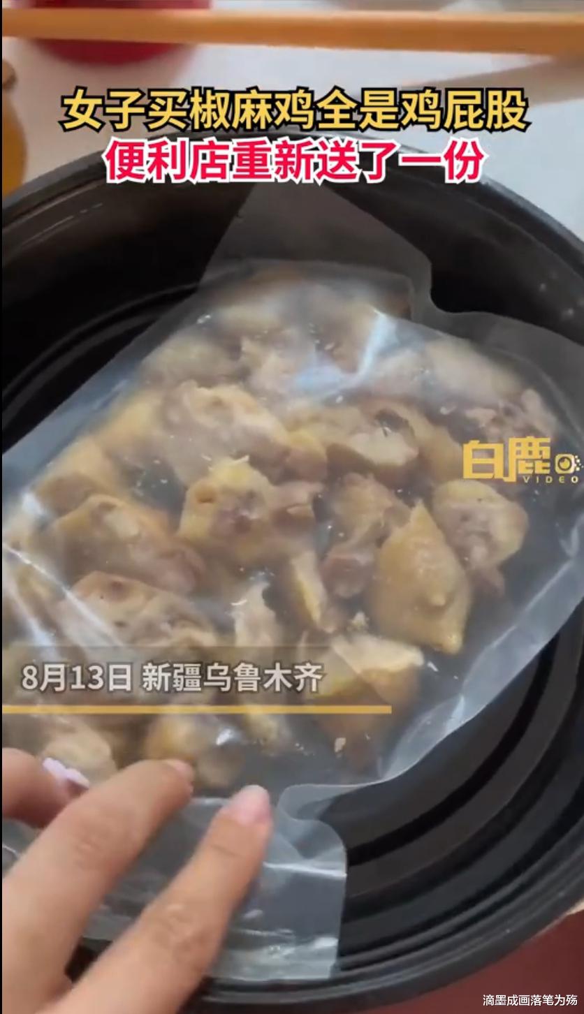 据新闻媒体平台报道,8月13日,新疆乌鲁木齐。燕女士从便利店订了一份椒麻鸡,收到后发现里面全都是鸡屁股。燕女士介绍,一份椒麻鸡27.9元,是半份鸡的量,自己收到后就打开看了,刚开始还以为是自己看错了,反复确认后有点生气。联系店员说明情况后,店员答应重新送一份。