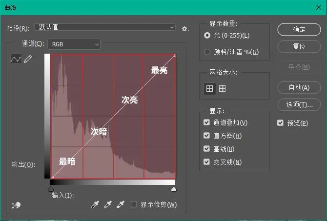 曲线工具(快捷键:Ctrl+M)把图中几个重要部分作了区分,曲线调色的原理就是将这几个部分进行调节,从而达到调色的效果。