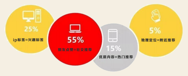 视频号的算法机制主要从“朋友点赞、兴趣推荐、热门推荐、附近推荐”等这几个方面综合推算,各有各的占比,如下图: