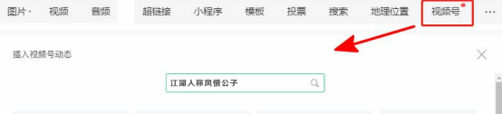插入路径:公众号编辑页的右上角>选中视频号并点击进入>通过搜索插入目标视频号动态卡片。