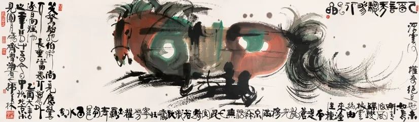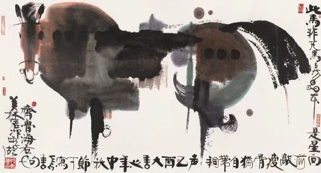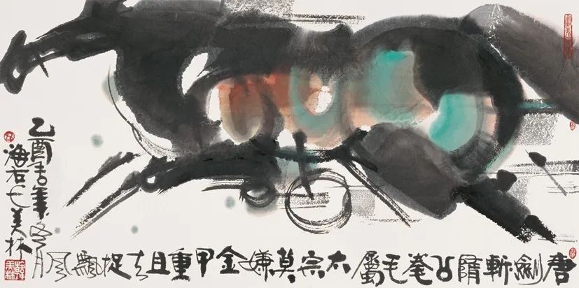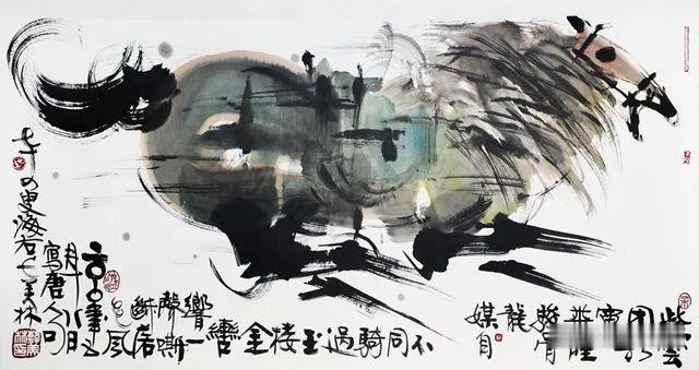 如果机缘巧合,你或许能够在现场看韩老师如何用水墨画马。如果正好是一张巨幅的作品或长卷,那场面就更加壮观。若逢韩老师有演示的心意与雅兴,自然更有淋漓尽致的看头。饱蘸墨水的排笔一经挥起,三条重要弧线已跃然纸上,那是韩老师把叶浅予先生教导的画马三片瓦”践行得风生水起。紧接着,笔墨所到之处,如剑走水面,又如疾风吹过。往前方,细小狭长的头部迅速形成,作温顺或嘶鸣状;中间主体,大面积的色块和强化渲染部分的点睛色彩构建了马匹伟岸的身躯;往后,疏密相生的鬃尾在空气中流动飘逸;往下,四蹄或不事张扬静静内敛地脚踏实地,或腾空奔跑飞跃呈现速度与力量之美。