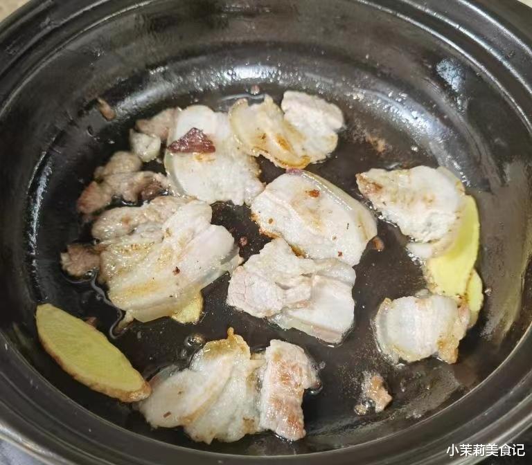 2、把砂锅烧热烧透,肉和姜倒里边,煸炒出香味来。