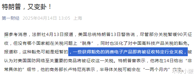 随后,美东时间4月11日深夜,美国海关与边境保护局(CBP)悄然更新了税则,对包括自动数据处理器、电脑、通信设备在内的多项商品实施了进口税率豁免,这一消息随后在周六得到了白宫的确认。