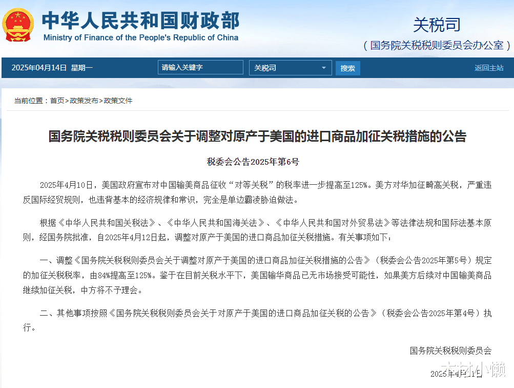 北京时间4月11日下午,经国务院批准,自2025年4月12日起,调整对原产于美国的进口商品加征关税措施,由84%提高至125%。
