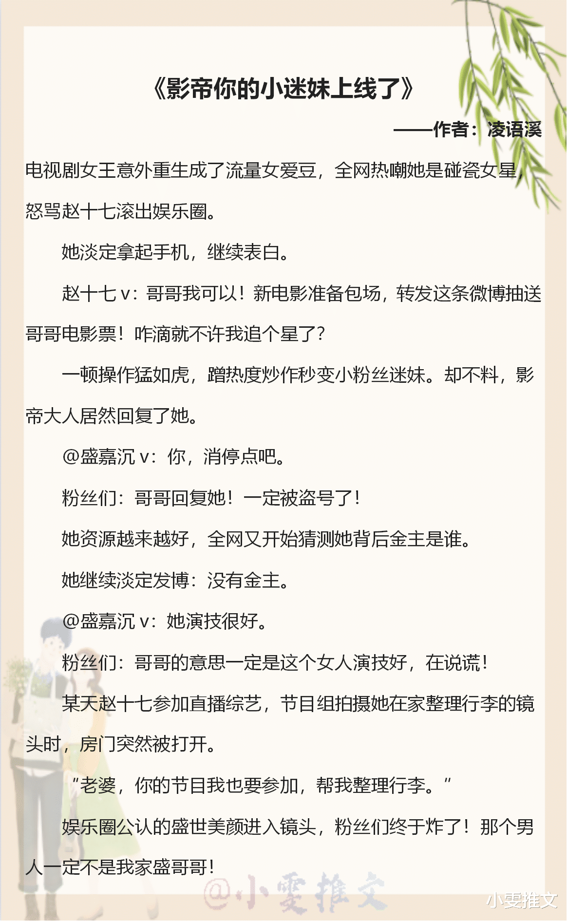 第一本女主高学历,为人温婉通透,男主也清和温润。这本书很好看。第二本影帝你的小迷妹上线了女主时柒重生到赵十七身上,性格温婉活泼积极,男主是影帝也是总裁,两人的感情过程很有看点,里面反映的网络暴力事件也令人深思。男女主之间特别甜。还涉及到多年前的阴谋。