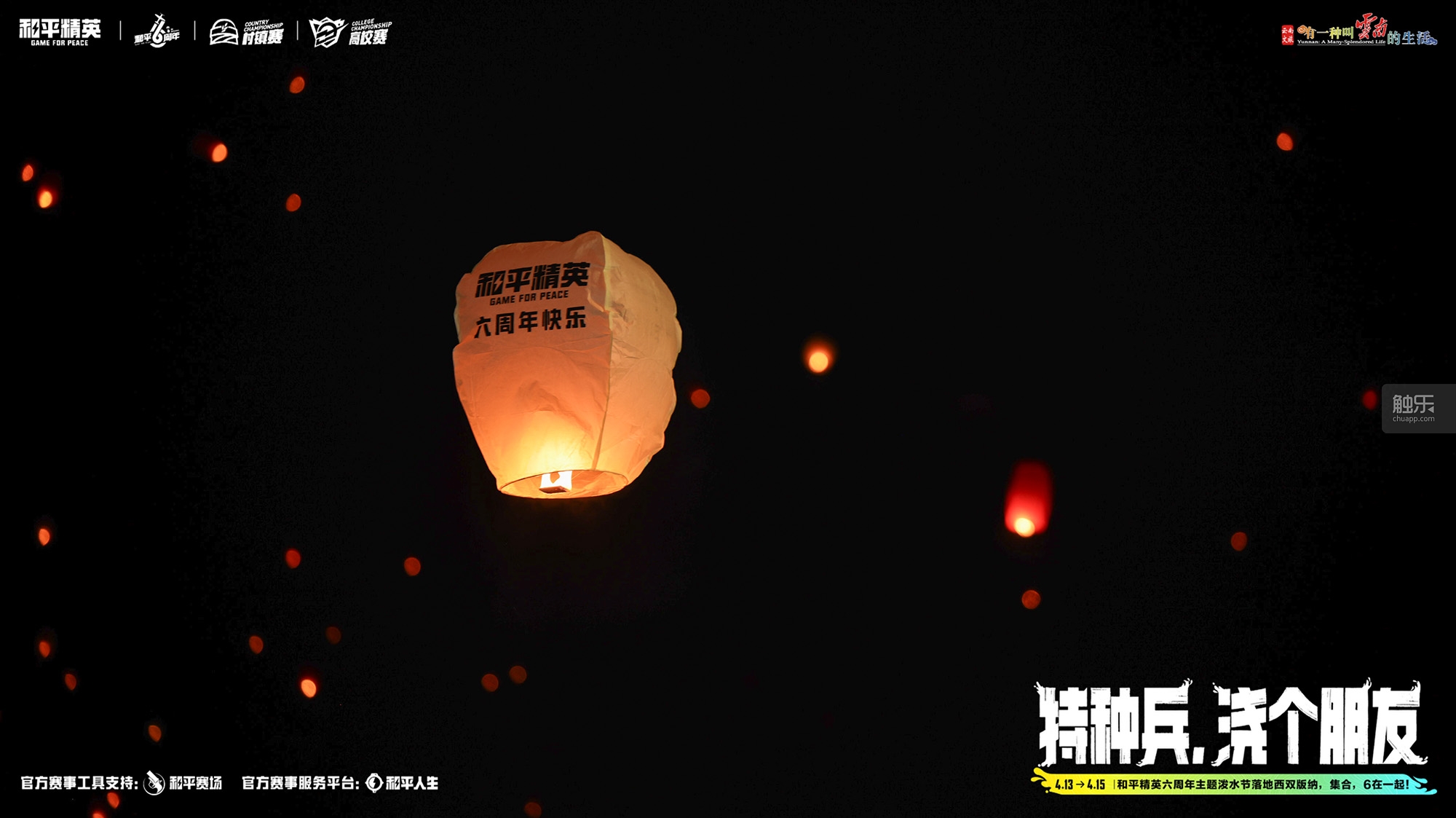 “开一个大Party”4月13日晚上的白象沙滩格外热闹,在经历了白天的村镇高校主播明星表演赛之后,近万名玩家共同放飞了5000盏写着“《和平精英》六周年快乐”的孔明灯。光点摇曳升空,点亮了西双版纳的夜晚。