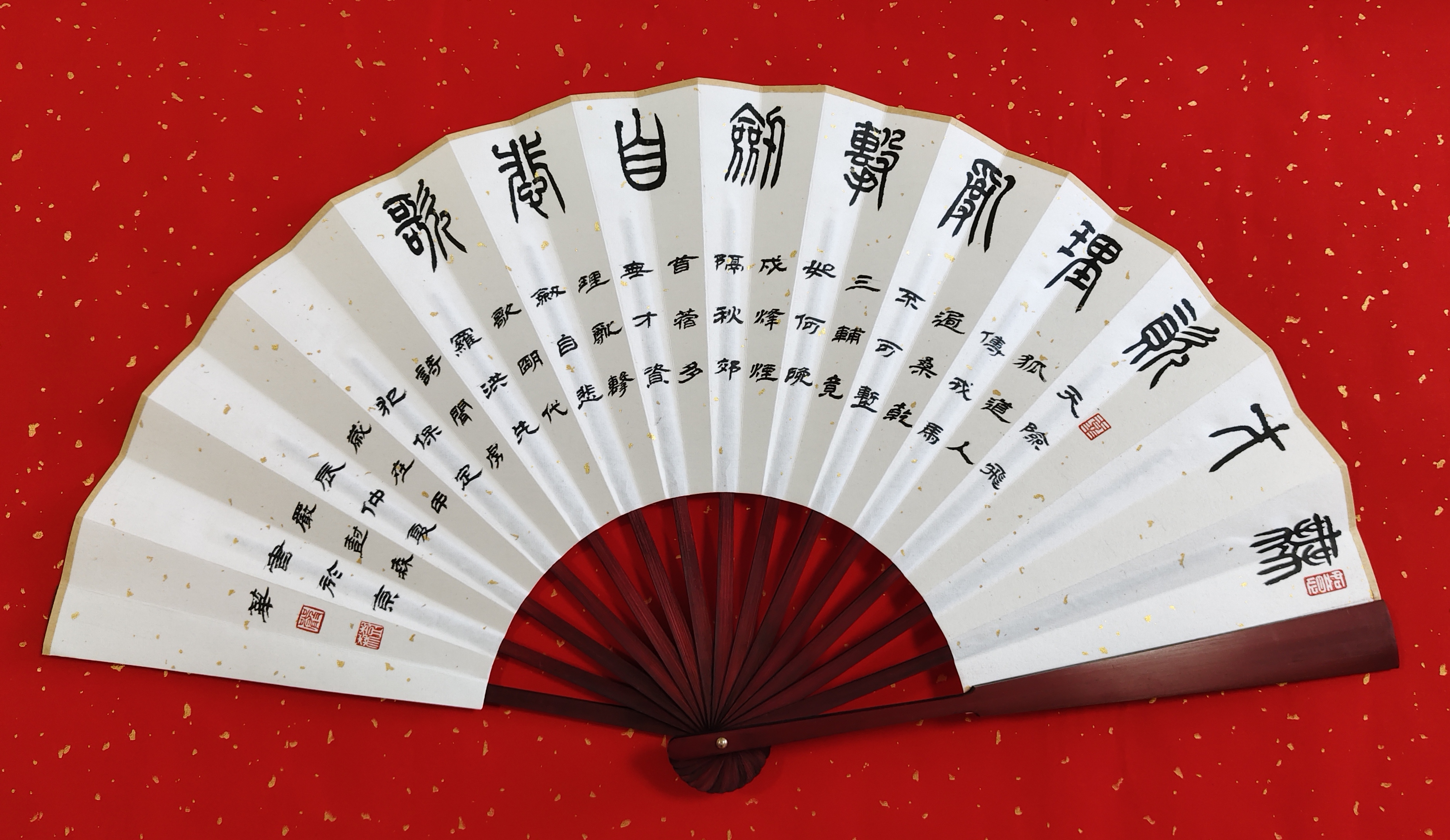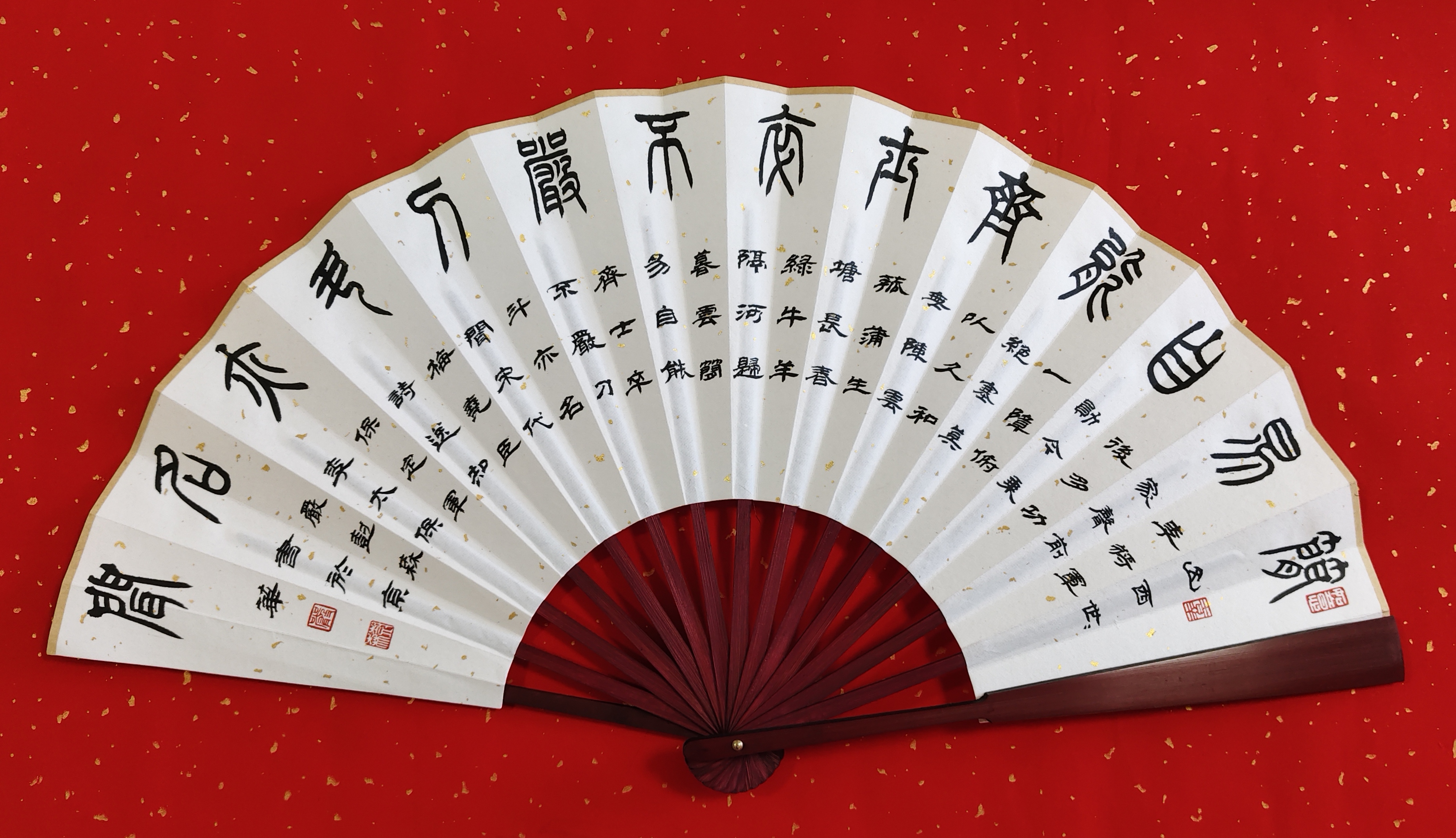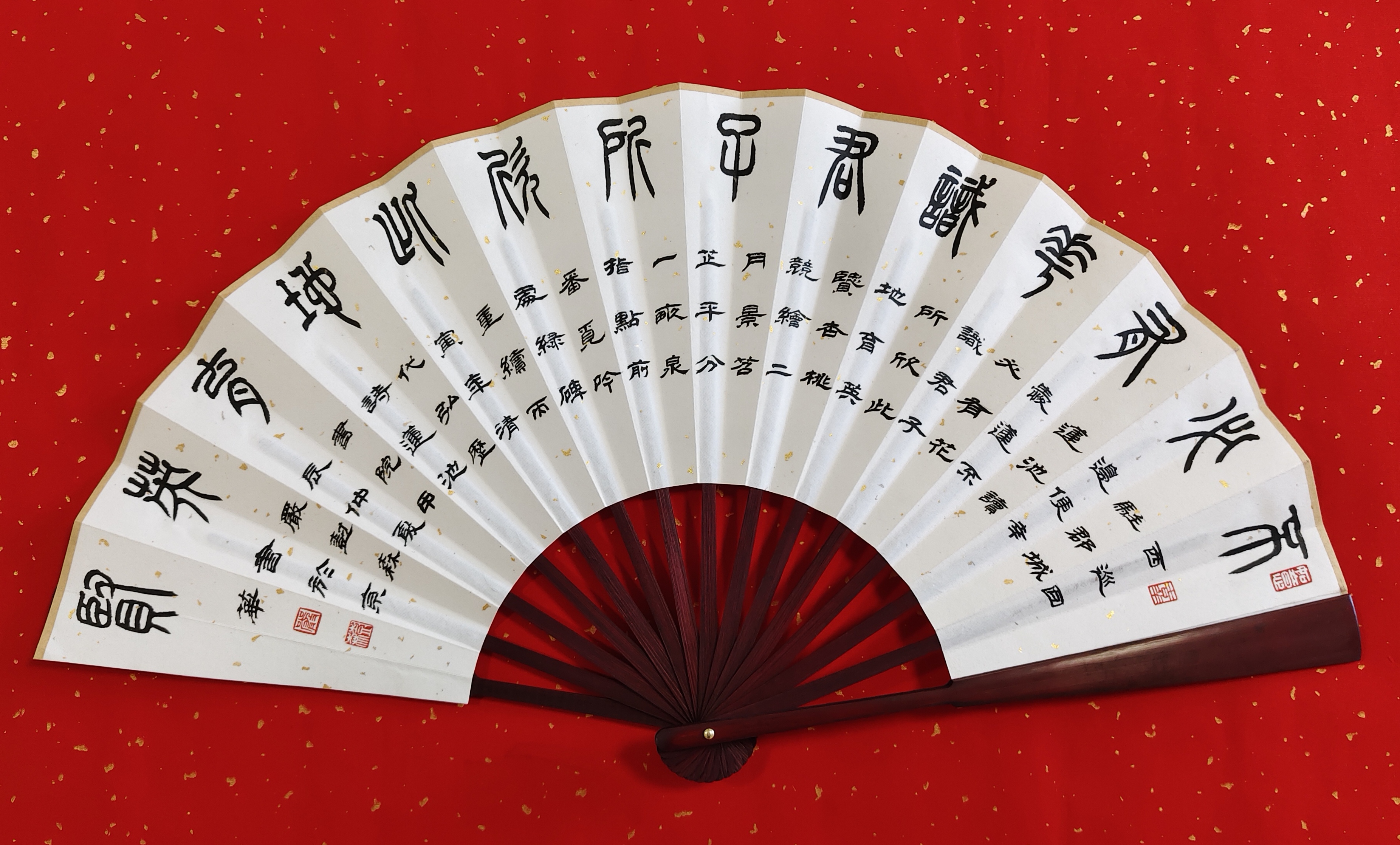 导语:保定,是河北省地级市,位于华北平原北部、河北省中部,与北京、天津构成黄金三角,互成掎角之势,自古是“北控三关、南达九省、地连四部、雄冠中州”的“通衢之地”。保定曾是直隶省会,直隶总督驻地,也是河北省最早的省会,保定是国务院命名的中国历史文化名城,有深厚的文化底蕴,市区内拥有众多名胜:大慈阁、直隶总督署、清西陵、狼牙山、白洋淀、冀中冉庄地道战遗址、古莲花池等。严树森之篆书扇面,采用古朴典雅的表现手法与宋代陈芳、宋祁、梅尧臣;明代罗洪先、沈周、王齐、郭登;清代吴汝纶、杨圻、弘历、乾隆古诗相互融合,将保定这颗璀璨明珠展现的熠熠生辉。