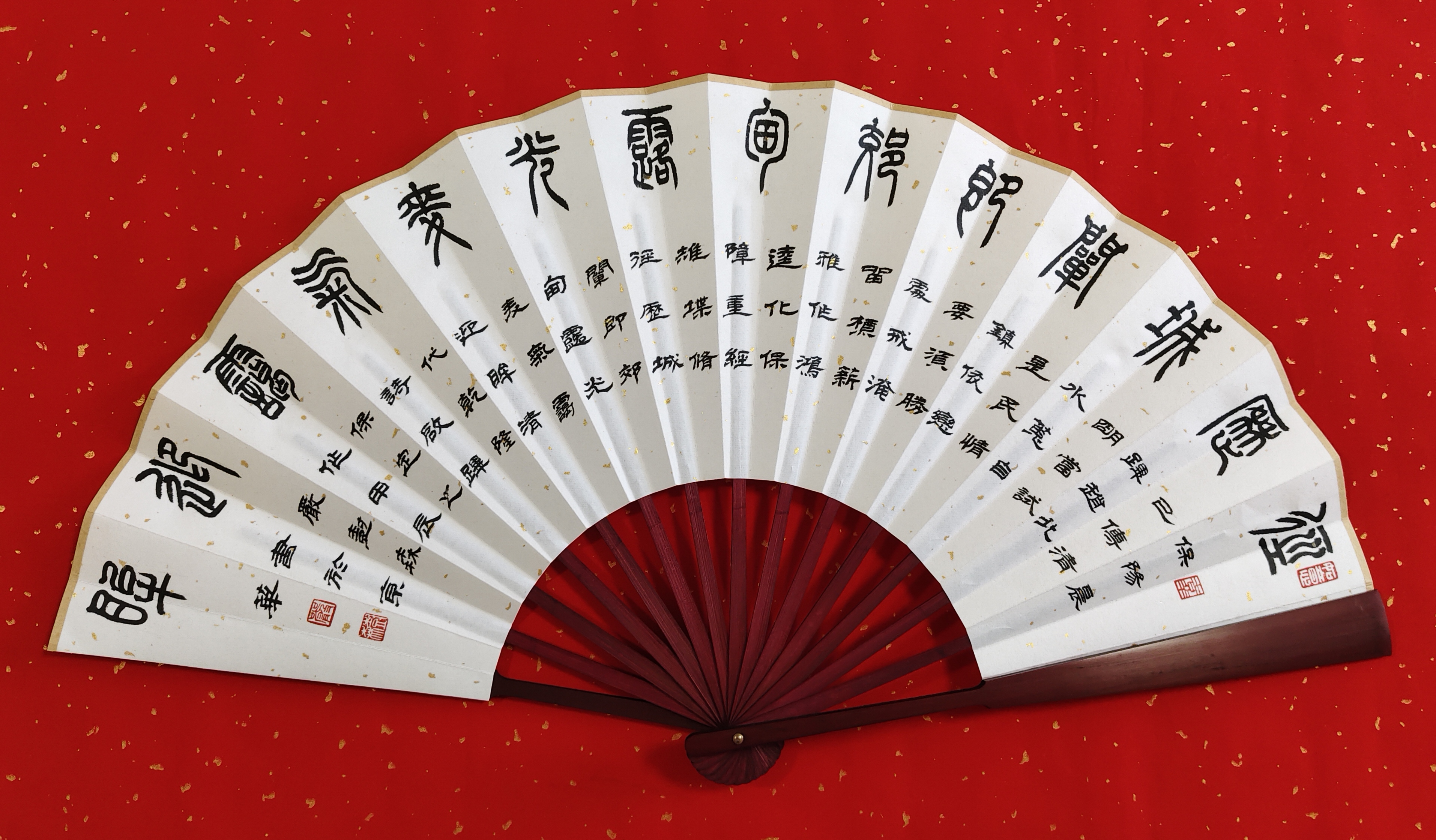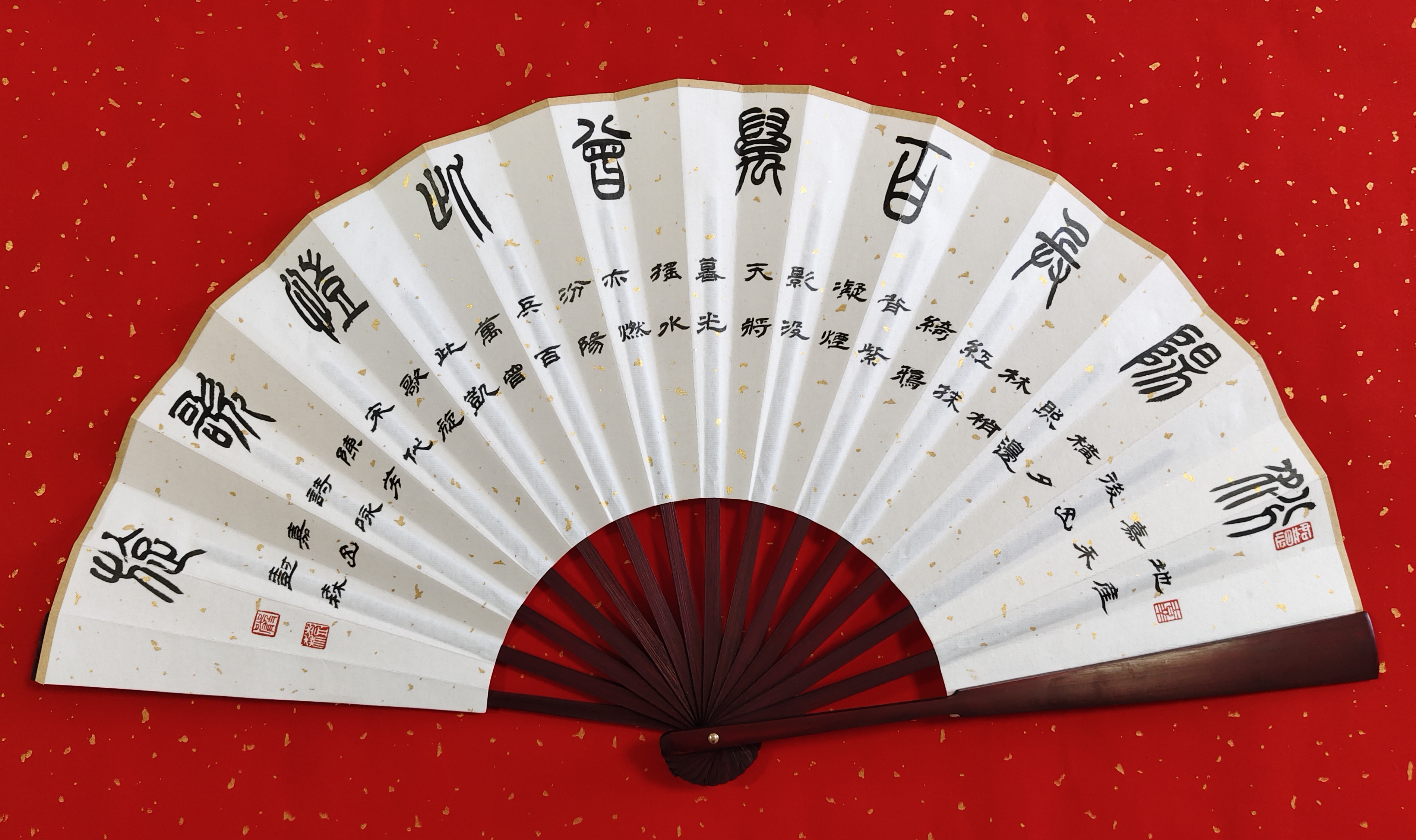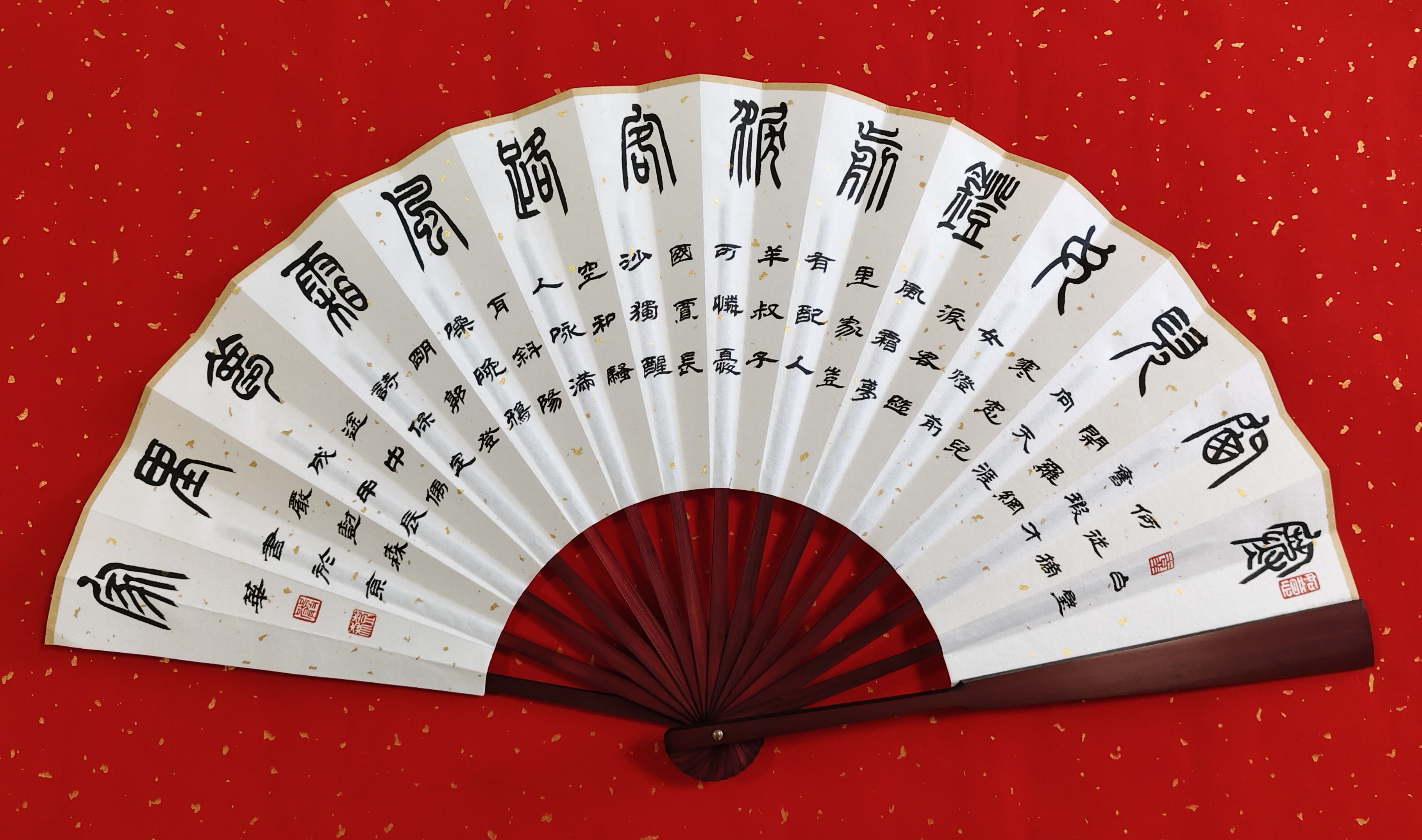 导语:保定,是河北省地级市,位于华北平原北部、河北省中部,与北京、天津构成黄金三角,互成掎角之势,自古是“北控三关、南达九省、地连四部、雄冠中州”的“通衢之地”。保定曾是直隶省会,直隶总督驻地,也是河北省最早的省会,保定是国务院命名的中国历史文化名城,有深厚的文化底蕴,市区内拥有众多名胜:大慈阁、直隶总督署、清西陵、狼牙山、白洋淀、冀中冉庄地道战遗址、古莲花池等。严树森之篆书扇面,采用古朴典雅的表现手法与宋代陈芳、宋祁、梅尧臣;明代罗洪先、沈周、王齐、郭登;清代吴汝纶、杨圻、弘历、乾隆古诗相互融合,将保定这颗璀璨明珠展现的熠熠生辉。